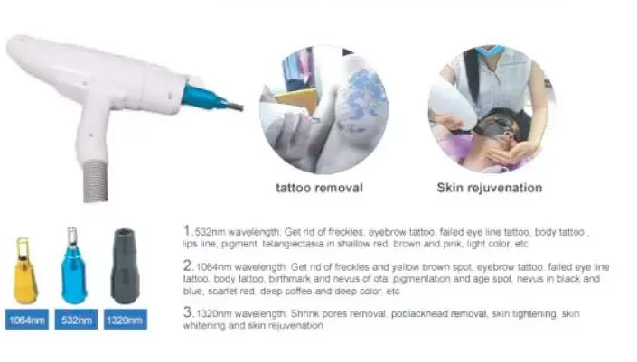 * The 1064nm wavelength: get rid of freckles, eyebrow tattoo, failed eye line tattoo, tattoo, Nevus of Ota, black and blue color and so on pigmentation;
