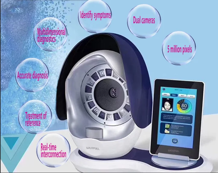 The new skin decoder is beautiful and high-grade. It uses a clear imported probe to accurately analyze the skin’s eight modules, pores, oil, elasticity, collagen, lead and mercury, red blood, acne and moisture. The data shows the test results, text analysis instructions, and automatically recommend matching products, allowing customers to more clearly and intuitively understand the results of the test and the actual changes in the skin before and after using the product, and can use the real 3D reduction technology to pay attention to the skin Stereoscopic 3D image, which can be analyzed and observed at any angle, and automatically recommend the corresponding products of your company according to the test results. Pre-built your company’s product information, the next store use is a stationed beauty guide and publicity version that never tires of wages and customers’ trust. It is a high-quality choice for cosmetics companies in the beauty-related industries and sales.