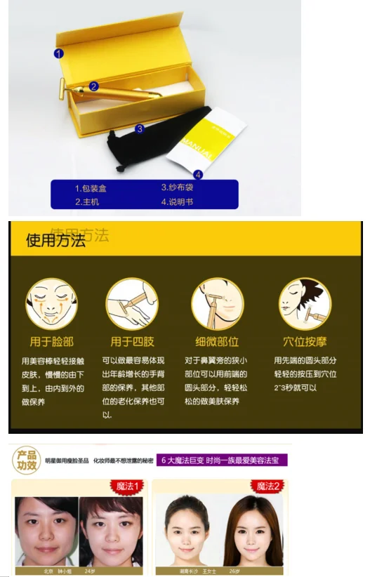 Product features: The head of the massage stick with the semiconductor metal germ together by rotating vibration massage. Function: Increases the elasticity of facial muscles to promote facial blood circulation and metabolism, thereby delaying and improving the natural aging caused by age-dependent skin relaxation, wrinkles, stains, bags under the eyes and multiple jaws. occur.