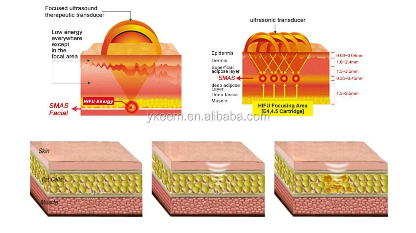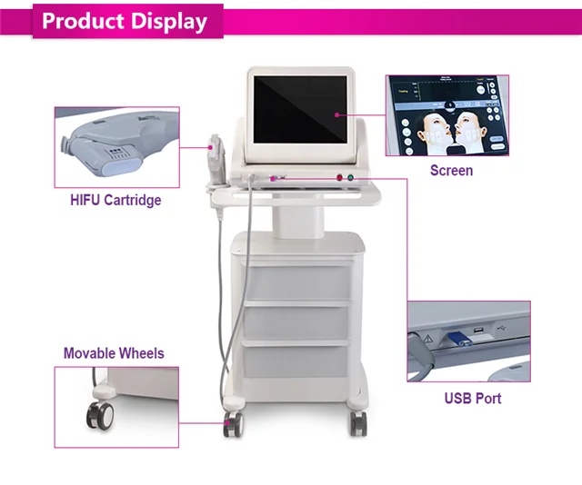 HIFU machine Function 2. Lifting and tightening both cheeks skin. 3. Improving skin elasticity and shaping contour. 4. Improving jaw line, reducing “marionette lines. 5. Tightening the skin tissue on forehead, lifting the eyebrows lines. 6. Improving skin complexion, making the skin delicate and bright. 7. Match with injecting beauty like Hyaluronic acid, collagen, to resolve more aging problem. 8. Removing neck wrinkles, protecting neck aging. 9. Body slimming and Body Shaping.