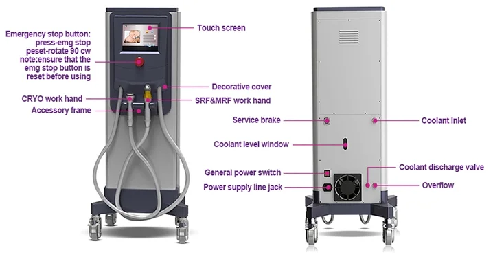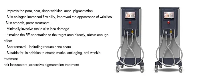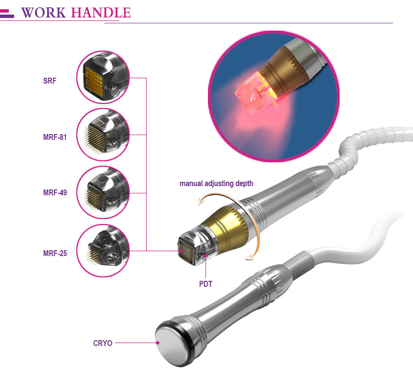 Fractional RF needle system through the special design of many fractional needle point array, the high speed digital motor controls order through the epidermis and the dermis accurate to control the depth of 0.25-3 mm,again by the end of lattice needle release RF,stimulate collagen and elastic tissue,and is not themal damage skin layer potentical.When skin tissues through this process,the epidermal layer is safe,RF energy can well to penetrate to the dermis,stimulate collagen protein hyperplasia,not only is the best way to improve the scars,but also long-term tightening skin wrinkles induced the good method. Cryo helps SRF and MRF play its function.