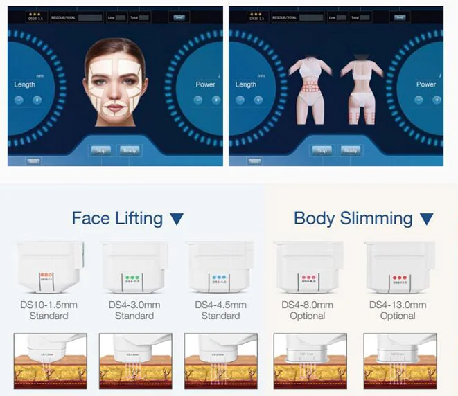 1. DS-4.5 4MHZ frequency used to transmit high- energy focused ultrasound to the skin, subcutaneous tissue, the ultrasound to penetrate the skin to a depth of 4.5mm, direct subcutaneous SMAS layer, forming “heat coagulation” regional, targeted to thicker skin, such as cheeks, etc.